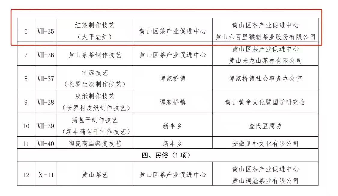 近日,黃山區(qū)人民政府正式公布第六批區(qū)級(jí)非物質(zhì)文化遺產(chǎn)代表性項(xiàng)目名錄,"紅茶制作技藝(太平魁紅)"成功入選。該技藝由黃山區(qū)茶產(chǎn)業(yè)促進(jìn)中心申報(bào),黃山六百里猴魁茶業(yè)股份有限公司作為保護(hù)單位參與傳承保護(hù)工作。